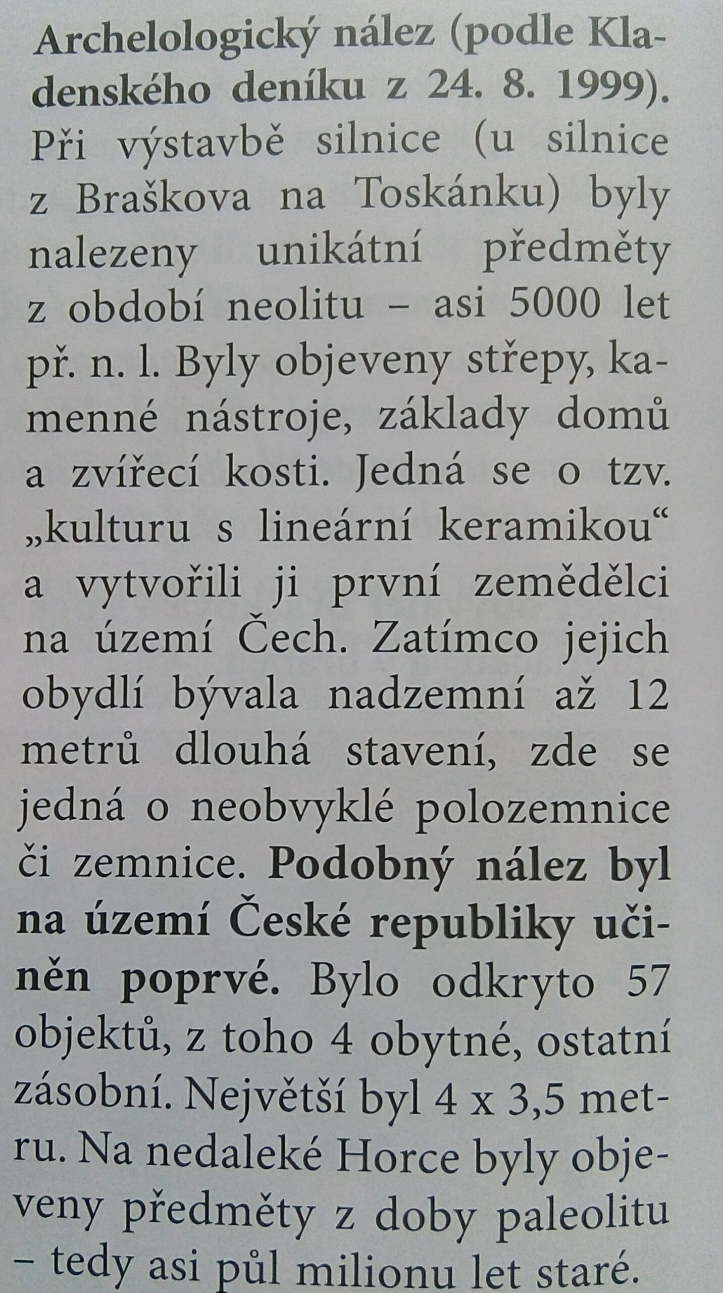 V roce 1999 se bagry zakously do svahu pod Horkou v katastru Braškova. Budovala se tu totiž dálnice (nynější D6) a její zahloubení mělo jednak umožnit podjetí mostu na silnici z Braškova na Kladno, jednak omezit negativní vlivy dálničního provozu na braškovské obyvatele. To první se docela povedlo, to druhé dosud není ani po čtvrtstoletí dořešeno vyhovujícími protihlukovými stěnami – ale už se na tom pracuje.